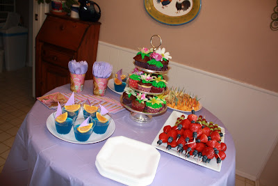 The most fun for me though was making the "tower" and cupcakes. Though as a six year old I dreamed of being a cake decorator, I had actually never held a piping bag full icing until two nights before the party. I started practicing on a plate and almost gave up. I was just trying to figure out how to make leaves or grass. Its amazing though what a little late night YouTube video instruction can do. It turns out I needed to thin the icing a bit to have the right consistency for what I wanted to do. I was happy with how it turned out. Dollar store faux flowers were the toppers on the cupcakes.